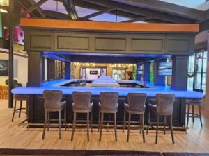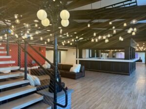 - Key Features: Large, open footprint, dramatic ceiling lines, warm lighting, and a central bar presence.