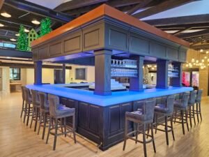 - A bar with roots: The first-floor main bar is over 90 years old, restored from Tuggie’s in Berwick, crafted from solid mahogany, and topped with white onyx featuring programmable, color-shifting lighting.
