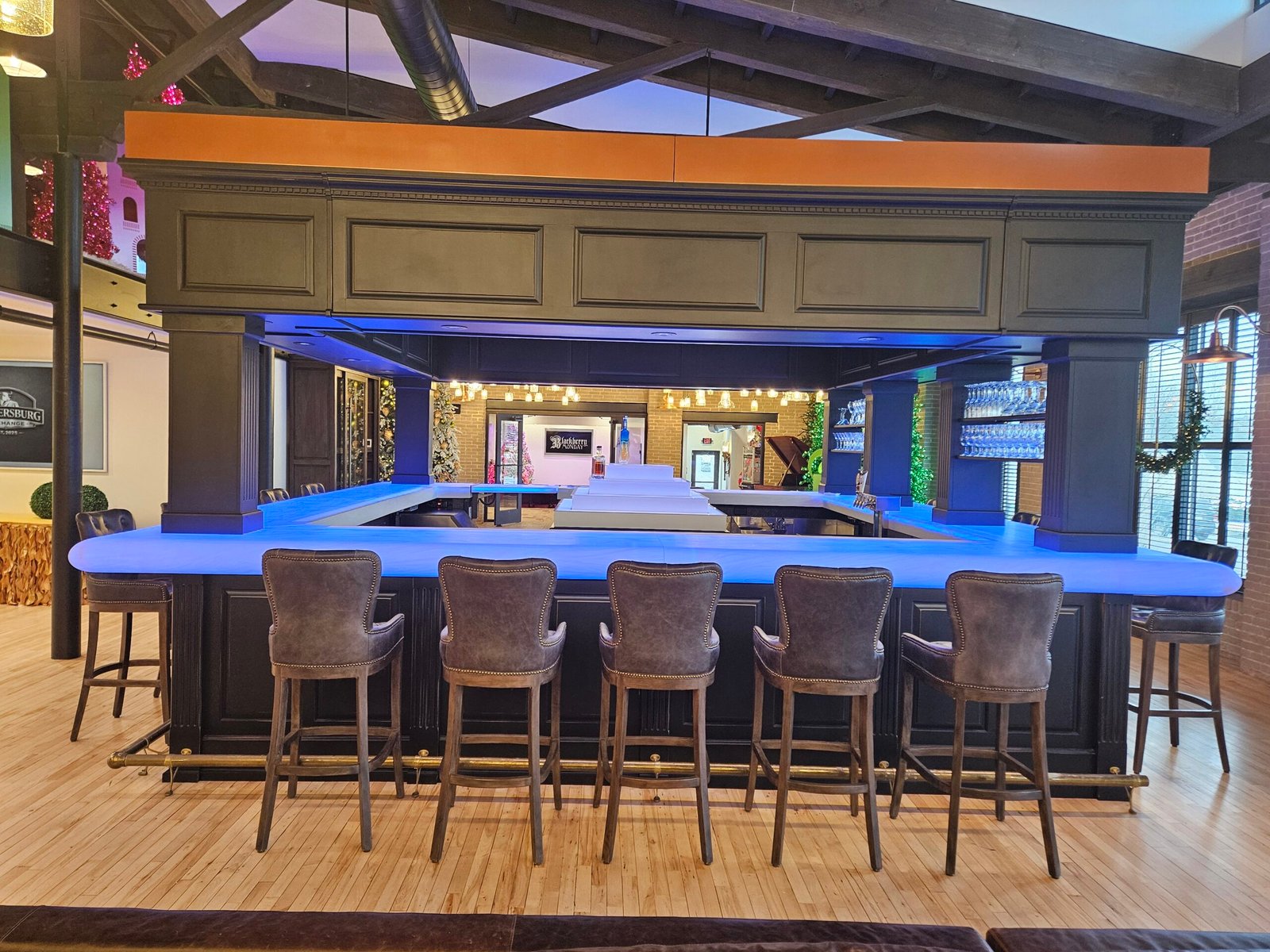 - A bar with roots: The first-floor main bar is over 90 years old, restored from Tuggie’s in Berwick, crafted from solid mahogany, and topped with white onyx featuring programmable, color-shifting lighting.